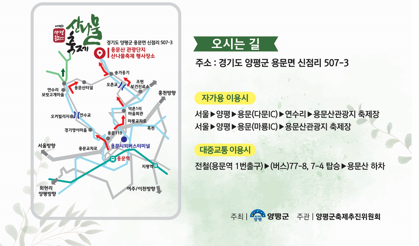 다양한 체험프로그램과 건강한 봄철 산나물이 풍성한 양평 용문산 산나물축제에 대해 알아보았습니다.