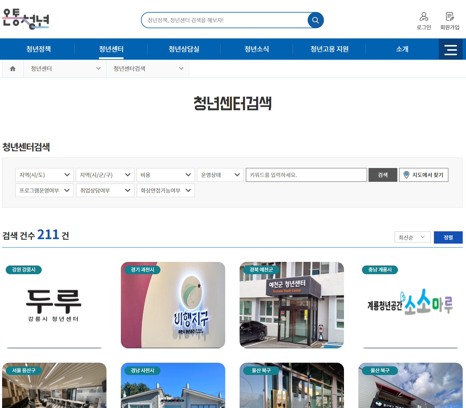 청년센터 메뉴에서 지역별 청년공간을 검색하고 정보를 얻을 수 있습니다. 19세 ~ 39세의 청년이 이용가능하며, 센터마다 부대시설이 다를 수 있으니 검색하여 이용하시면 좋습니다. 취창업교육, 창업지원, 회의공간 대여, 여가 휴식 공간, 취미클래스, 심리상담, 현직자멘토링, 토크콘서트등 다양한 활동이 있으니 유용하게 이용하시면 됩니다.