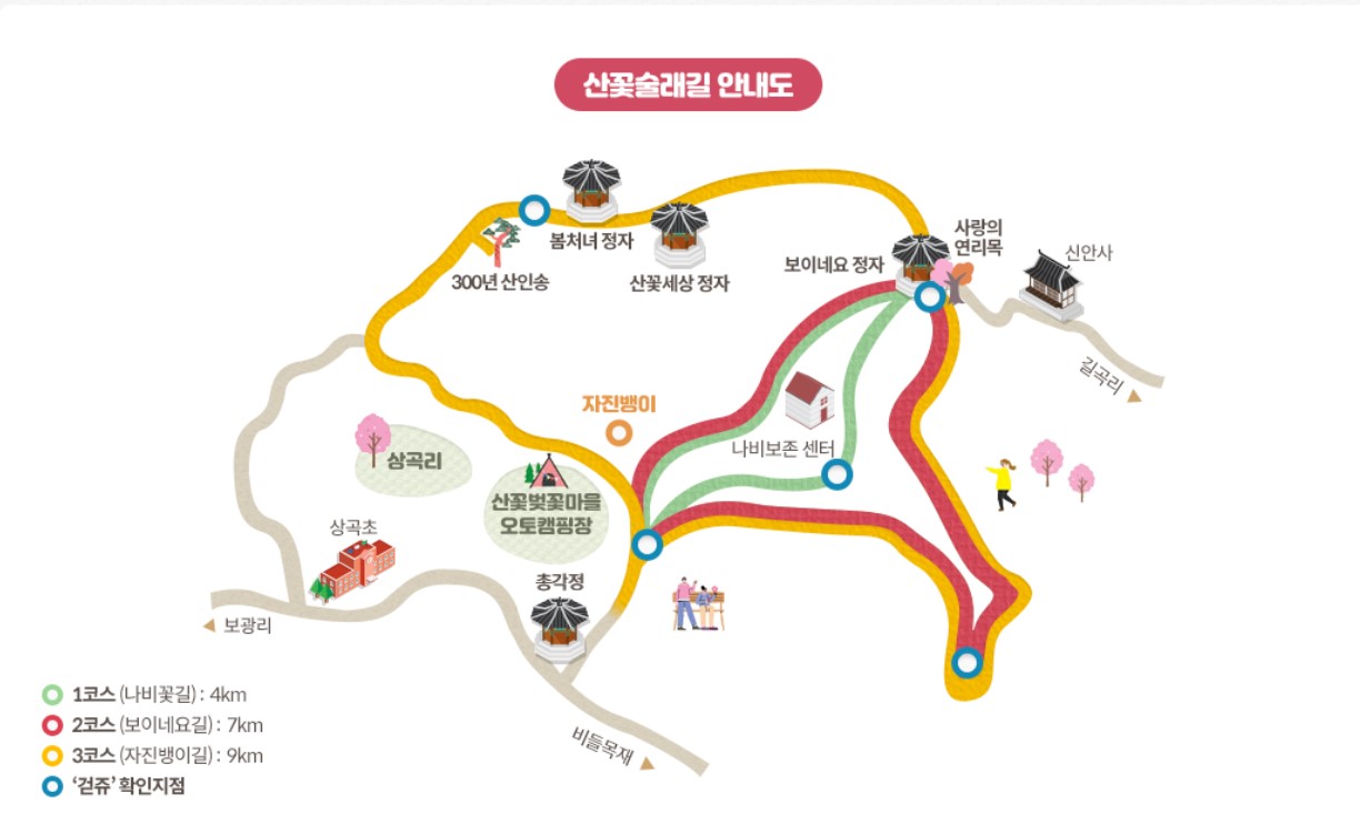 - 장소 : 산꽃벚꽃마을 오토캠핑장 및 산꽃술래길 일대(금산군 군북면 자진뱅이길 39)
