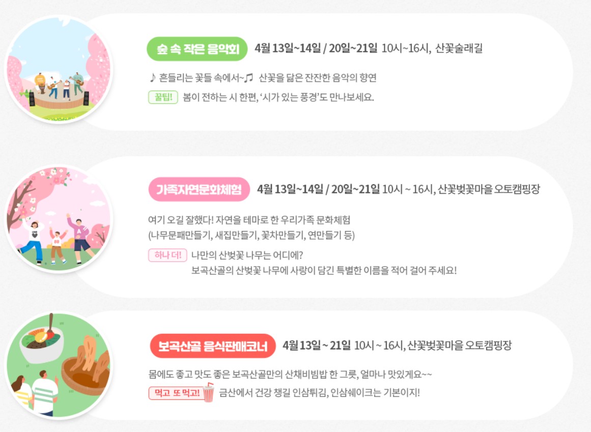 - 장소 : 산꽃벚꽃마을 오토캠핑장 및 산꽃술래길 일대(금산군 군북면 자진뱅이길 39)
