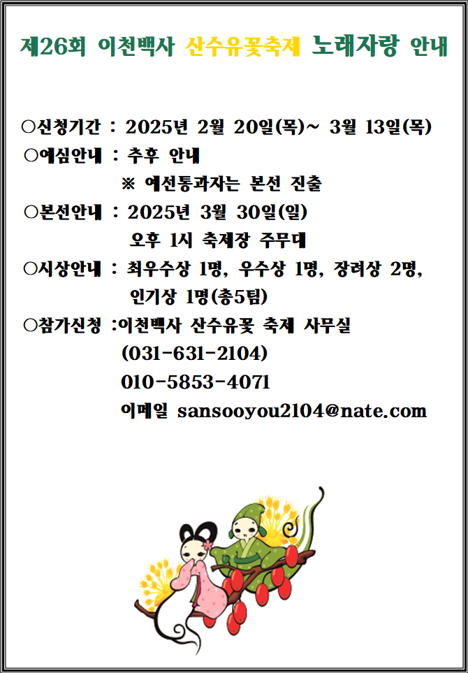산수유꽃축제 노래자랑이 있으니 참가하셔서 좋은 추억 남기셔도 좋을 듯합니다.